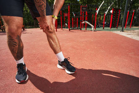 Muscle injury. Man with sprain thigh muscles. Athlete in sports shorts clutching his thigh muscles after pulling or straining them while jogging