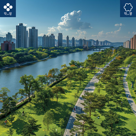 A serene view of the scenic Ttukseom Hangang Park along the Han River, perfect for picnics and leisurely walks.