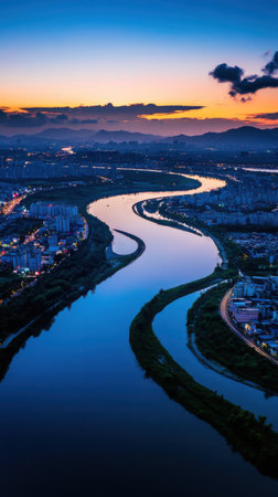 The tranquil landscape showcases a city during sunset, with rivers artfully meandering through urban areas. Illuminated buildings create a stunning reflection on the water.