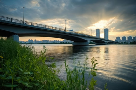 Sunset view of the city river bridge
