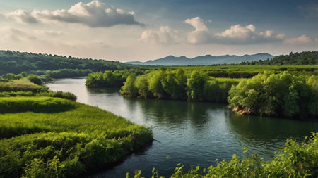 A breathtaking view of a river winding through green valleys, bordered by gentle hills and bright blue skies adorned with fluffy clouds, showcasing nature's beauty.