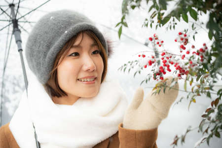 Woman holding umbrella outdoors in snowy winter