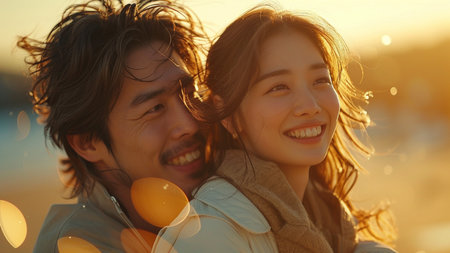Happy asian young couple in love on the beach at sunset.