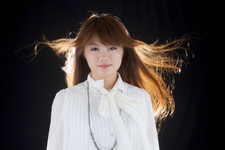 Portrait of a beautiful Asian woman in black shirt on dark background