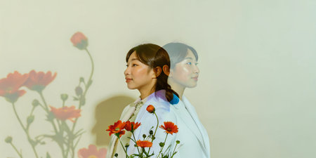 Asian female figure in white coat poses with colorful flowers, creating a harmonious blend of nature and art, evoking feelings of peace and inspiration