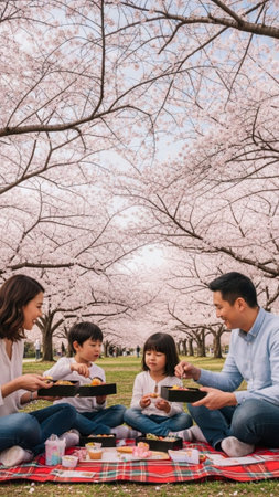 A stunning vertical, full-body shot of a diverse family enjoying a tranquil Hanami (cherry blossom v