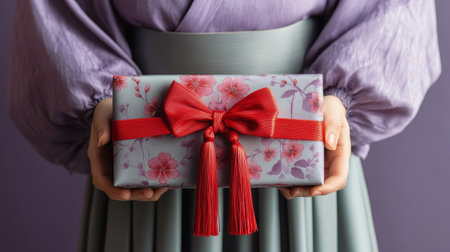 An individual dressed in traditional attire presents a beautifully wrapped gift adorned with flowers and a red ribbon. The setting showcases cultural elements that create an inviting atmosphere.