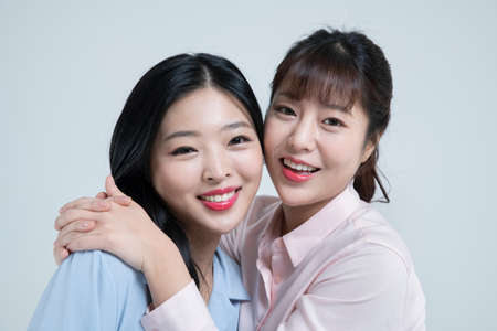 closeup of two beautiful Asian women, sisters