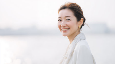 A woman stands by the water, smiling and looking at the camera. The background shows a cityscape with soft light. It is a bright day and the scene feels cheerful and inviting.