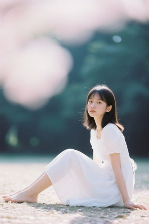 Outdoor woman in white sitting on the ground