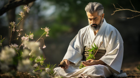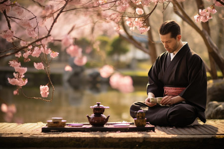 A man dressed in a traditional kimono sits on a wooden platform overlooking a serene pond, A traditional Japanese tea ceremony under a cherry blossom tree, AI Generated