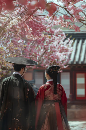 Japanese couple in traditional clothes in a Japanese garden with cherry blossoms in springtime.