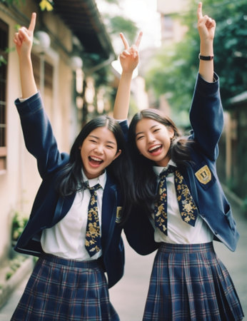 Generative AI : Happy children girls girlfriend schoolgirl student elementary school