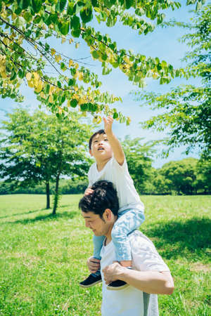 a father and a little boy walking on the green space with piggybacks on fine day