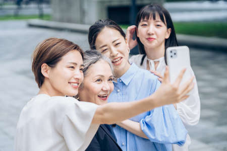Women of various ages taking commemorative photos outdoors