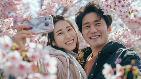 Japanese couple taking selfie in the sakura blooming garden