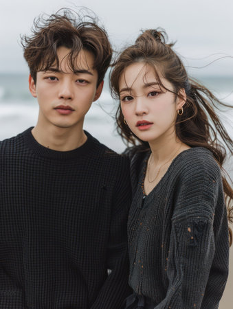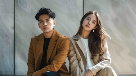 A fashionable Asian couple poses in stylish attire against an urban backdrop.