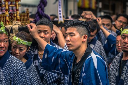 Tokyo - May 19, 2019: People celebrating the Sanja Matsuri festival in traditional clothes in Asakusa, Tokyo, Japan