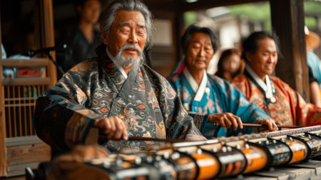 Chuseok Festival. A harmonious blend of traditional music and lively chatter fills the atmosphere, creating a sense of joyous celebration.