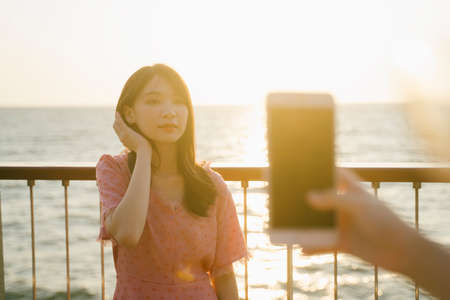 Long hair girl standing at the silver fence in the evening with sunset view while her friend take a photo.