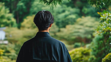 Serene Moment Man in Traditional Attire Finds Peace in Lush Green Nature, Tranquility and Retreat