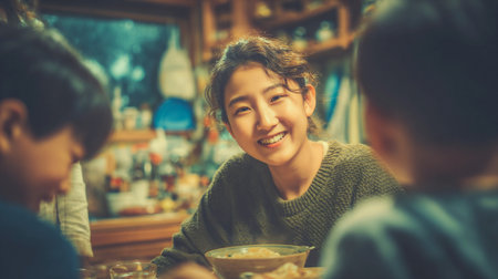 Korean family dinner. Happy woman smiles during a dinner at home. A girl smiles warmly at the camera while seated at a table with her brothers, enjoying a meal together in a cozy setting. Rustic house