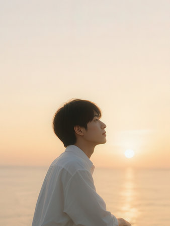 Young asian man looking at the sunrise over the sea, side view