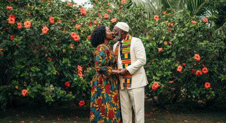 Elderly african couple embracing in colorful traditional attire amidst lush tropical garden