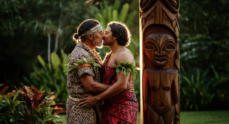 Cultural connection in tropical setting with embrace between two pacific islanders for celebration design