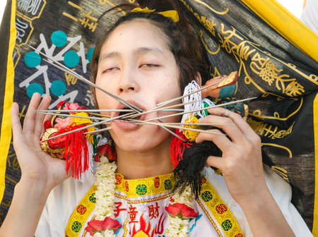 Phuket Vegetarian Festival. Shocking asian tradition - body piercing.