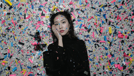 A woman poses with her hand on her face while colorful confetti falls around her. She stands in a creative space during a celebration filled with bright colors.