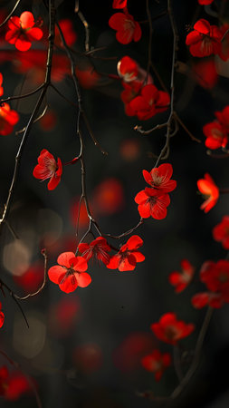 Red flowers on a tree branch in the garden. Natural background.