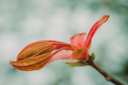 Close-up of a flowering tree branch showcases soft pink blossoms and vibrant green leaves. The composition features a shallow depth of field, with a blurred green backdrop. The scene evokes springtime and natural beauty. Suitable for use in various design projects and commercial applications.