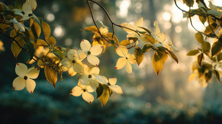 The Kousa dogwood at dawn soft golden sunlight kissing leaves clean air natural color