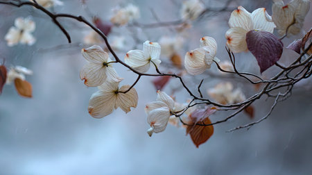 Soft rain falling gently on Dogwood, with water droplets forming and slowly dripping. The background is softly blurred with a natural, moody atmosphere.