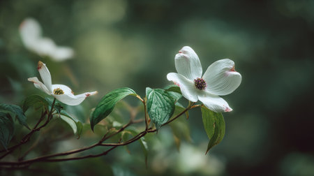 A detailed photograph of a single Dogwood, swaying gently in the wind, captured in natural daylight. Fresh and airy atmosphere, soft motion blur on leaves, crisp details on textures, background softly blurred into natural greenery, cinematic natural light, realistic photography style.