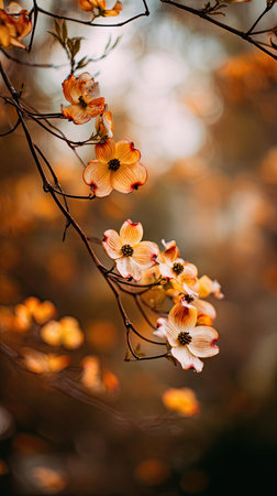 The Flowering dogwood in fall, warm amber light, crisp air, shallow depth of field, soft natural bokeh, true to life color, minimal styling.