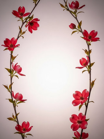 Red flowers and green leaves on a white background with space for text