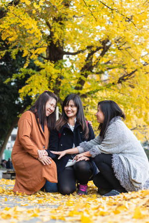 Three Asian woman look up the autumn maple trees in Japanese garden, Tokyo, Japan.