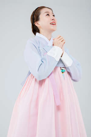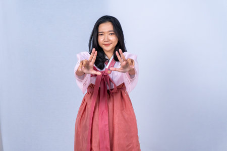 Young Asian woman in traditional pink Korean Hanbok dress pointing down with both hands