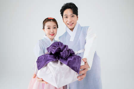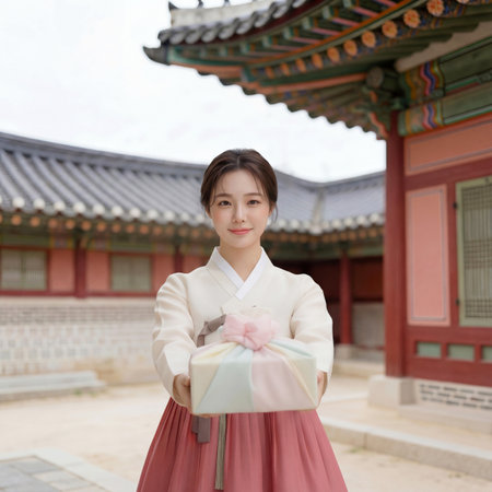 Woman in Korean traditional clothes holding a gift box and looking at camera