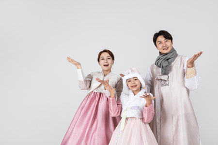 Korean family in Hanbok, isolated white background-surprised with hand outstretched