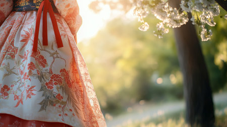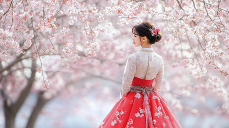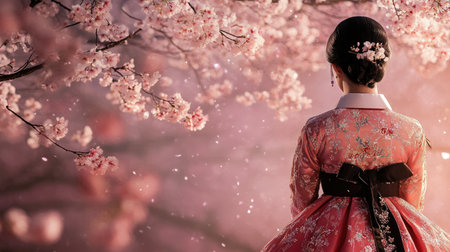 Traditional Korean Hanbok dress against a backdrop of cherry blossoms