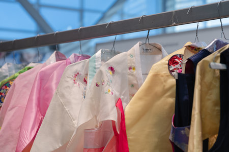 Hanbok - Korean traditional women dress vibrant colors for attire during traditional occasions: celebrations, festivals, ceremonies. Dress hanging on clothes hanger. Kamchatka, Russia - Oct 17, 2019