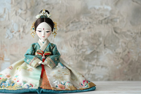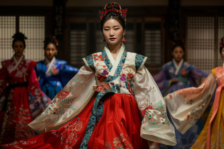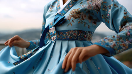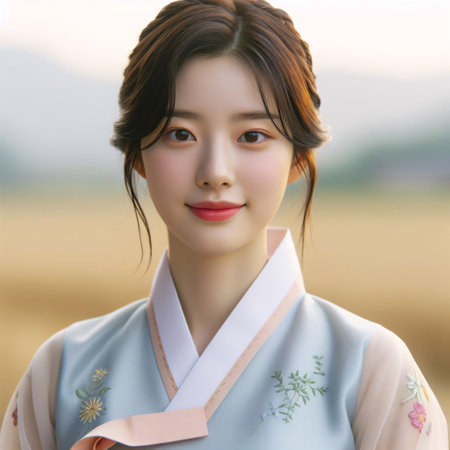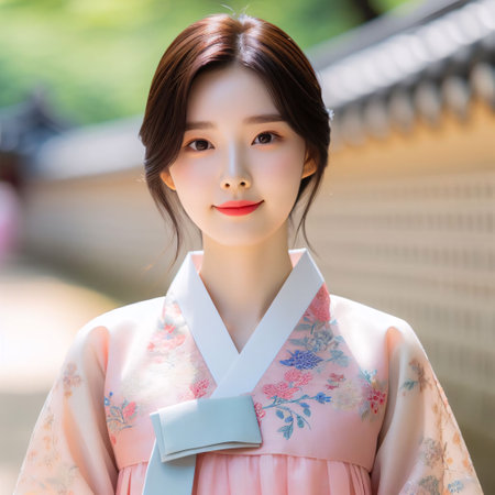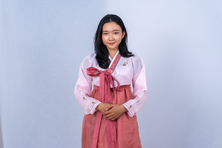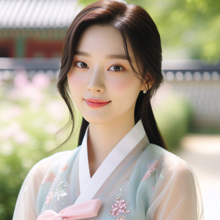 Beautiful young woman posing gracefully in traditional Korean hanbok decorated with delicate embroidery