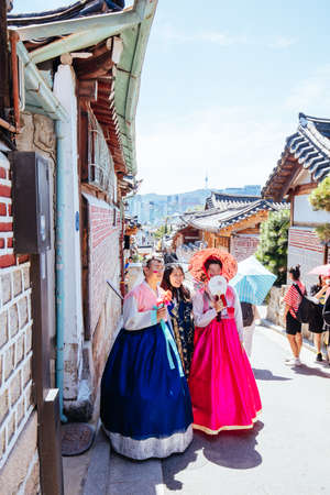 Seoul, South Korea - June 3, 2017: Young women in colorful traditional wear - hanbok visiting the Gyeongbokgung Palace.
