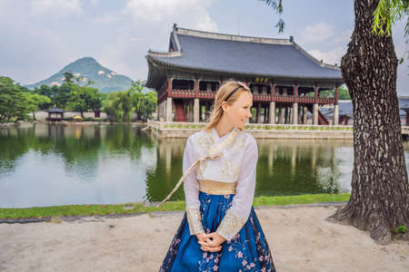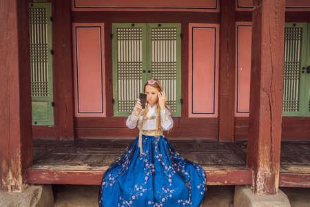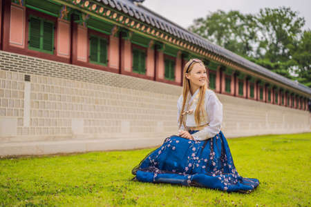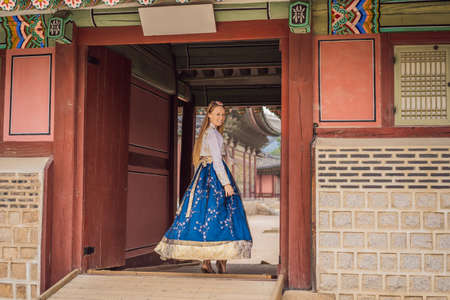 Young caucasian female tourist in hanbok national korean dress at Korean palace. Travel to Korea concept. National Korean clothing. Entertainment for tourists - trying on national Korean clothing