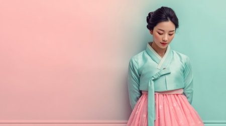 A serene portrait of a woman dressed in traditional attire, surrounded by soft pastel colors. This image captures the essence of cultural elegance and beauty in a tranquil setting.