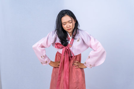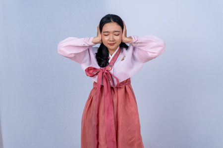 Young Asian woman in pink Hanbok covers ears with hands, eyes closed, light background