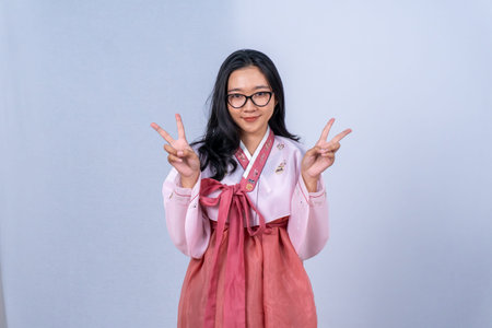 A young woman wearing a pink and brown Hanbok, making peace signs, smiling at the camera